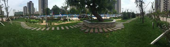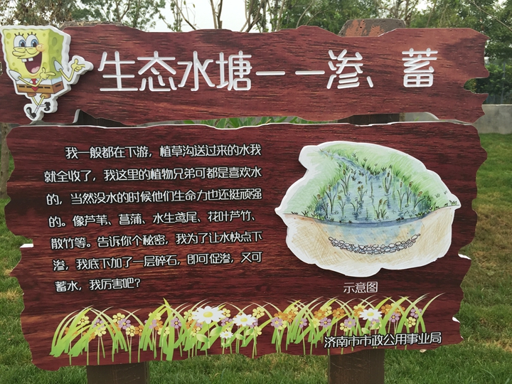 是濟南首條“海綿主題路”。道路共有三大綠地系統(tǒng),透水人行道、植草溝、生態(tài)水塘、齒狀沿石、溢流井、下沉式綠化帶、PP蓄水模塊和旱溪八種不同的部分構(gòu)成了完整的海綿系統(tǒng),分別起到滲、蓄、凈、排等作用。