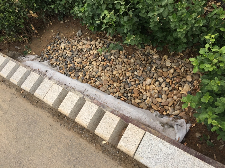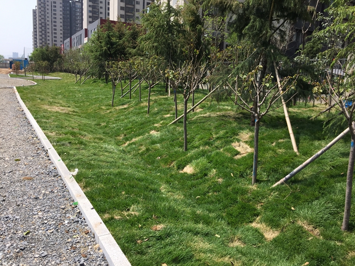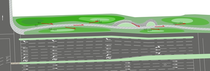 機非隔離帶做下沉式綠化帶,寬度2.5~3.5米,蓄水深度20cm。