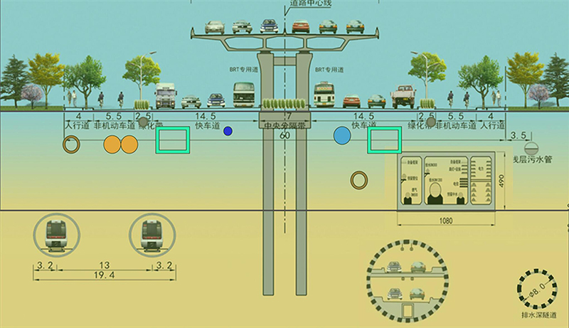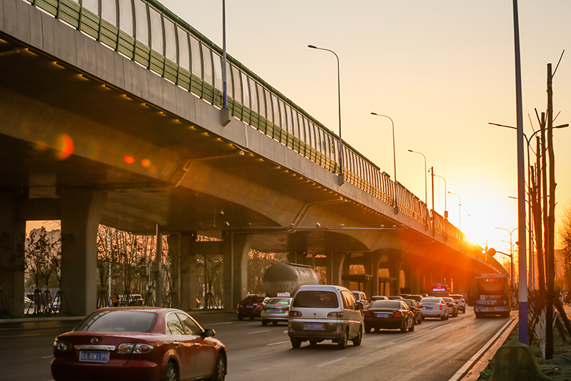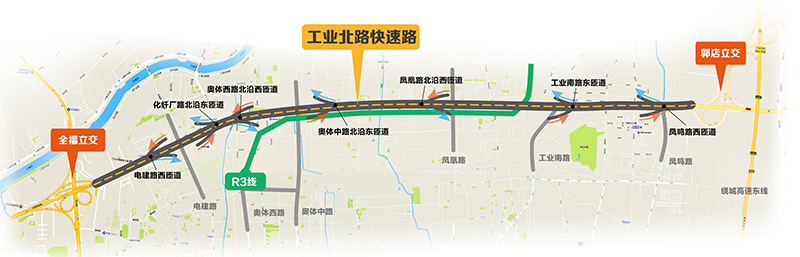 工業(yè)北路快速路西起全福立交橋,東至郭店立交,長13.6公里,標(biāo)準段寬25.5米,雙向6車道。沿線共設(shè)置8對匝道,其中7對實現(xiàn)高架橋梁與地面道路的連接,在郭店立交設(shè)置一對專用匝道實現(xiàn)高快轉(zhuǎn)換。