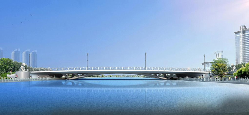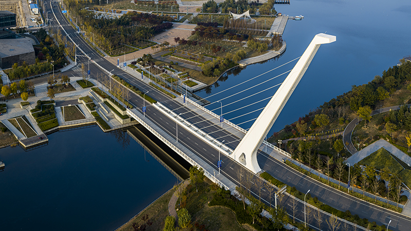 匯智橋路南、北橋均為無(wú)背索獨(dú)塔單索面斜拉橋,橋跨 82 米,全寬 33.5 米;智力島路橋?yàn)閱慰缧滦托笨渴焦?/span>